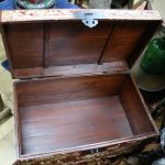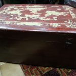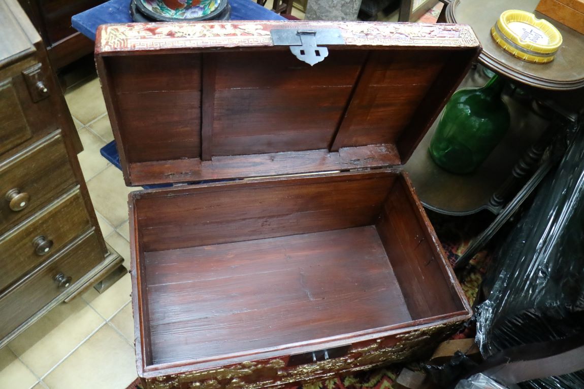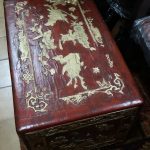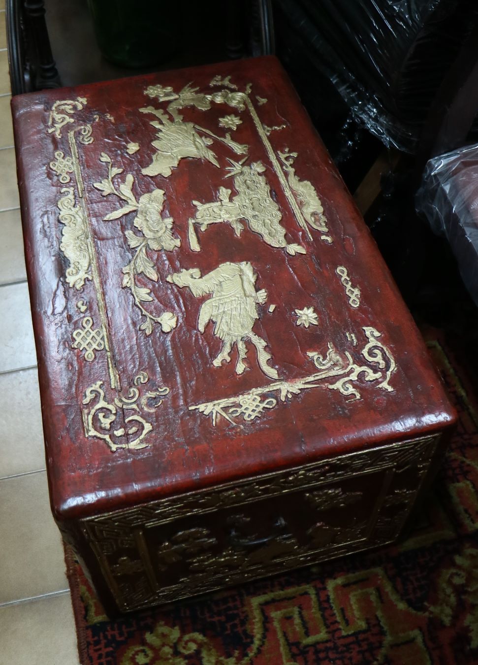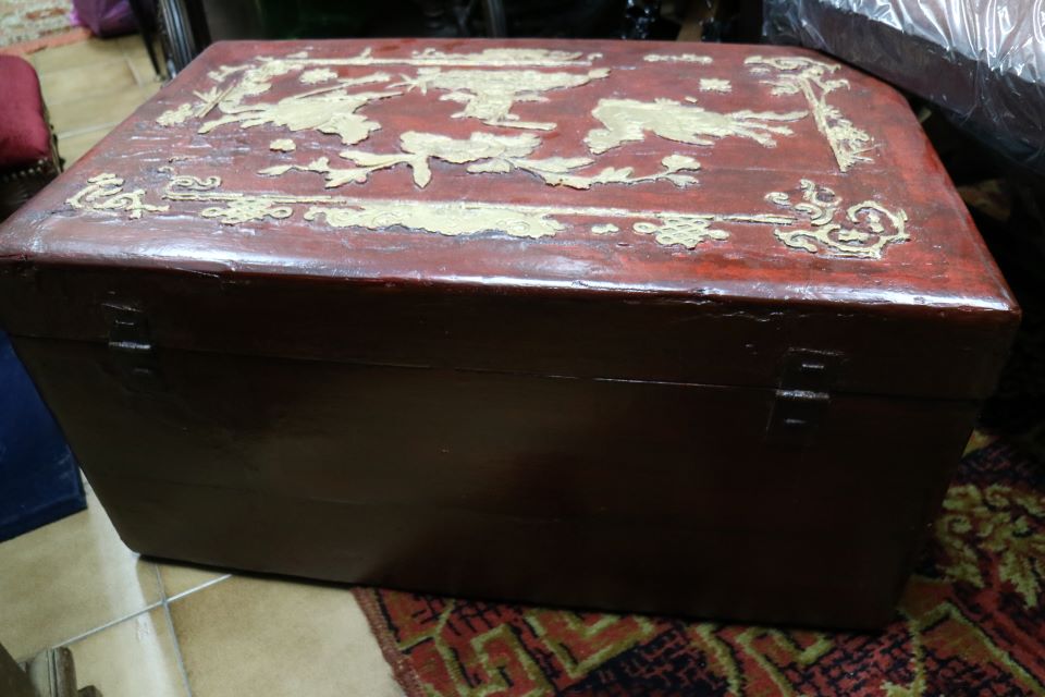 Baú em madeira de cânfora lacada a vermelho e dourado.