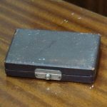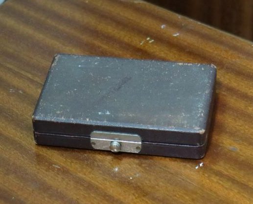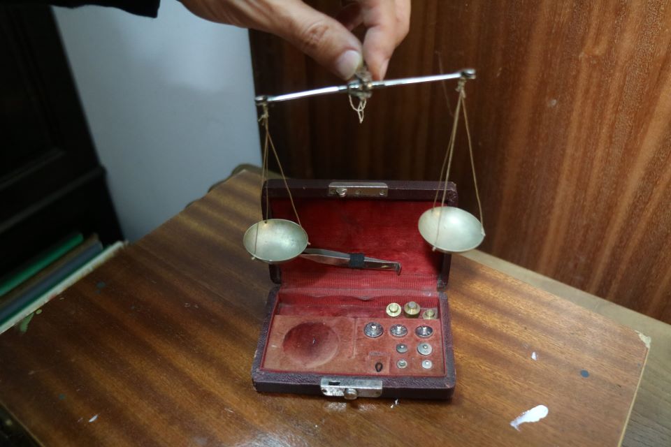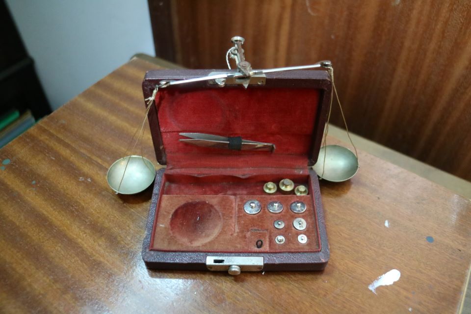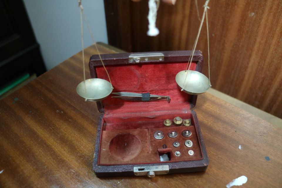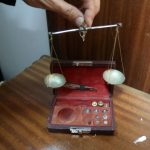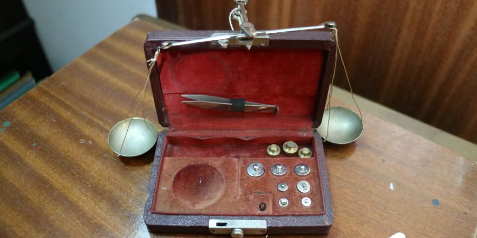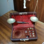 Balança de joias antiga em latão com caixa de veludo, escala de equilíbrio com pesos em grama.