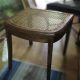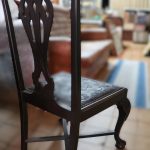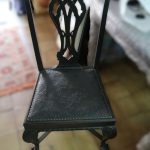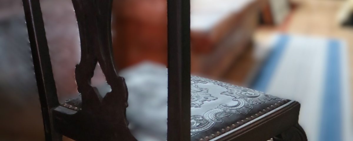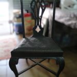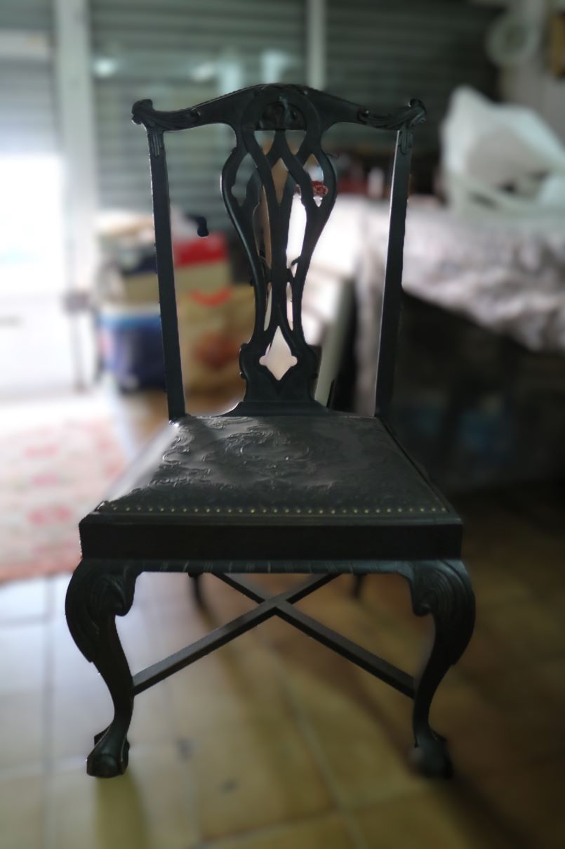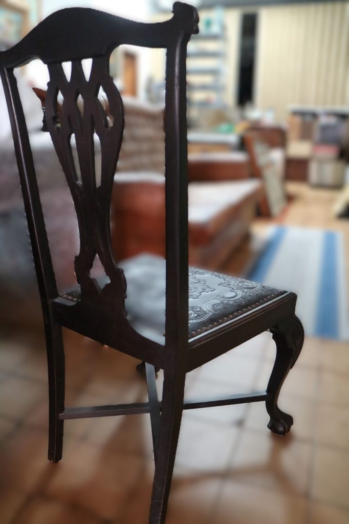 Cadeira em madeira escurecida ao estilo D. José, assento em couro lavrado e guarnecido com tachas em latão.