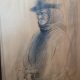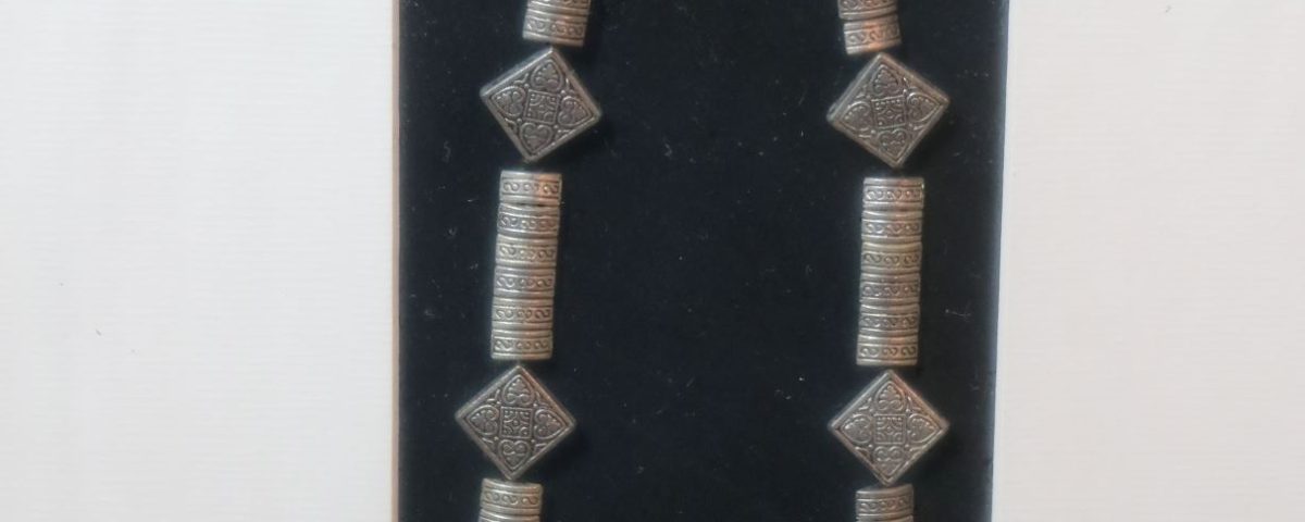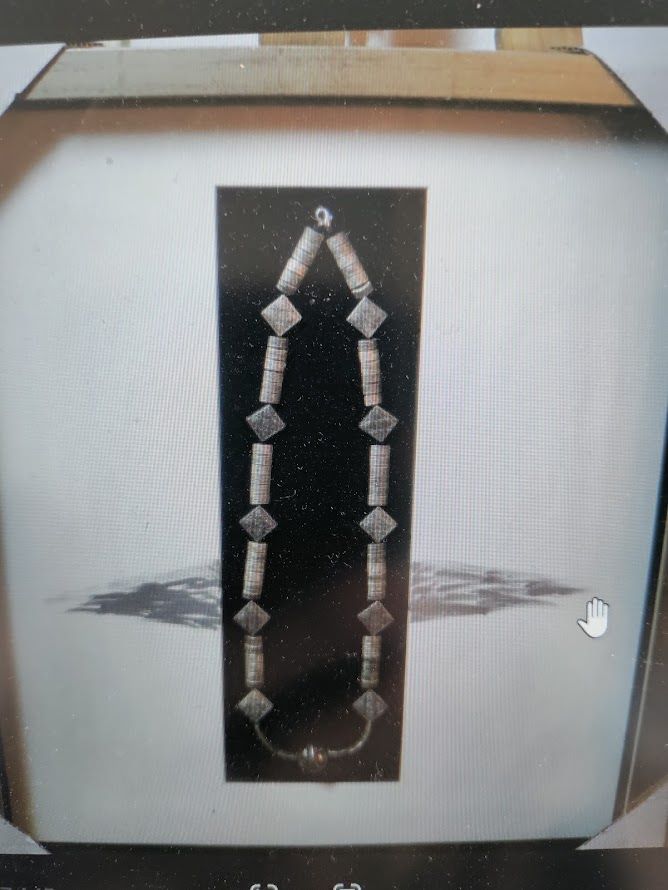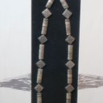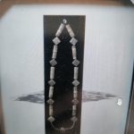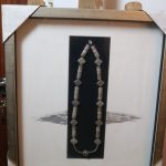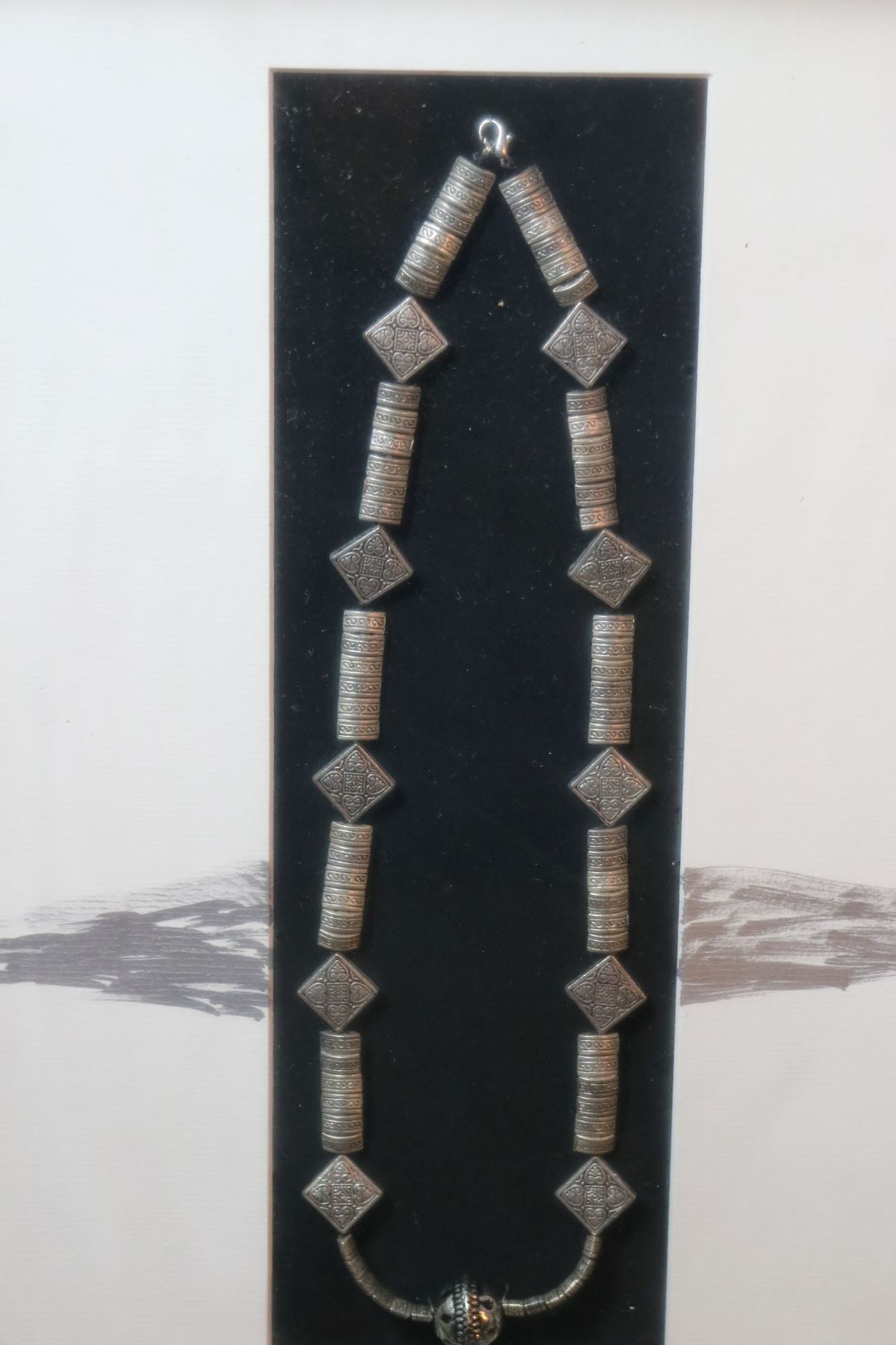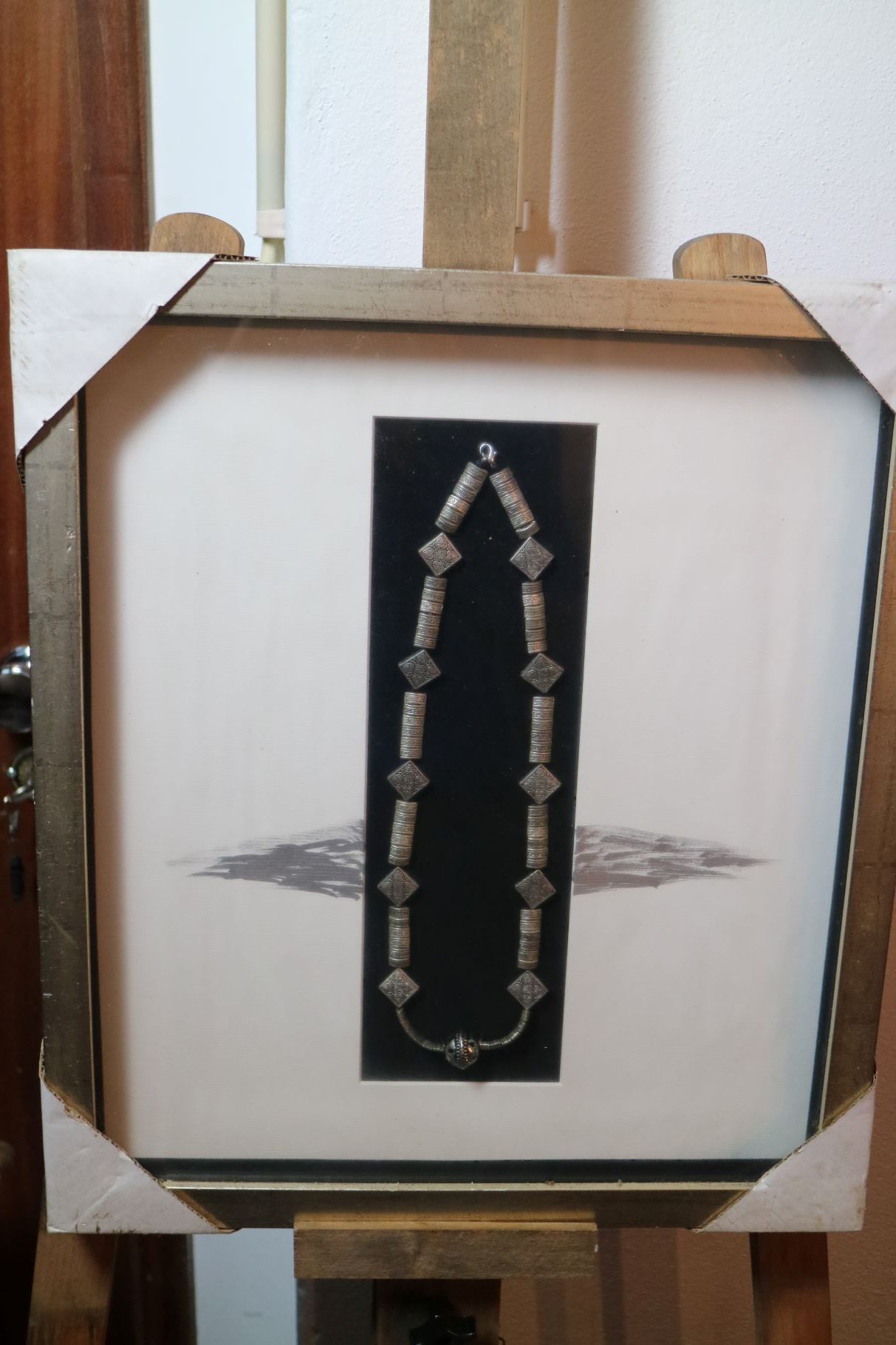 Quadro de parede com Colar Étnico em metal prateado (?) com desenhos a grafite nas laterais, sobre fundo branco. Moldura em caixilho de madeira pintada em cinza prata.