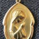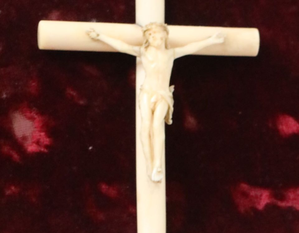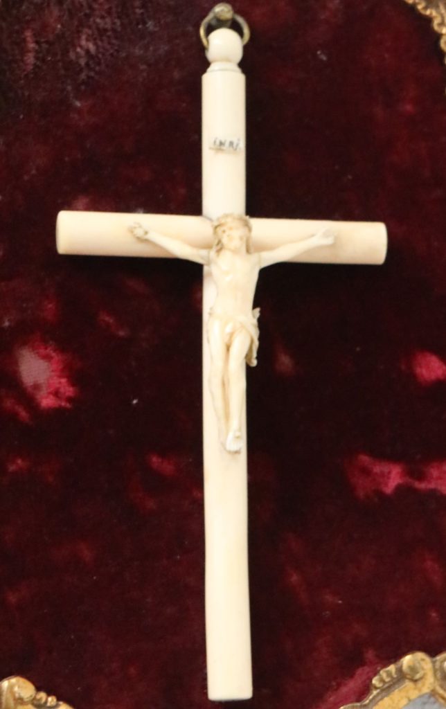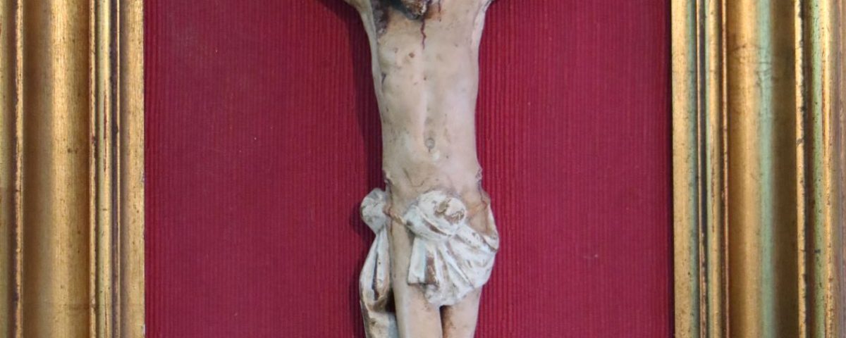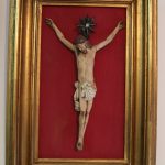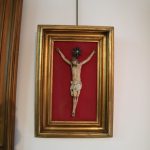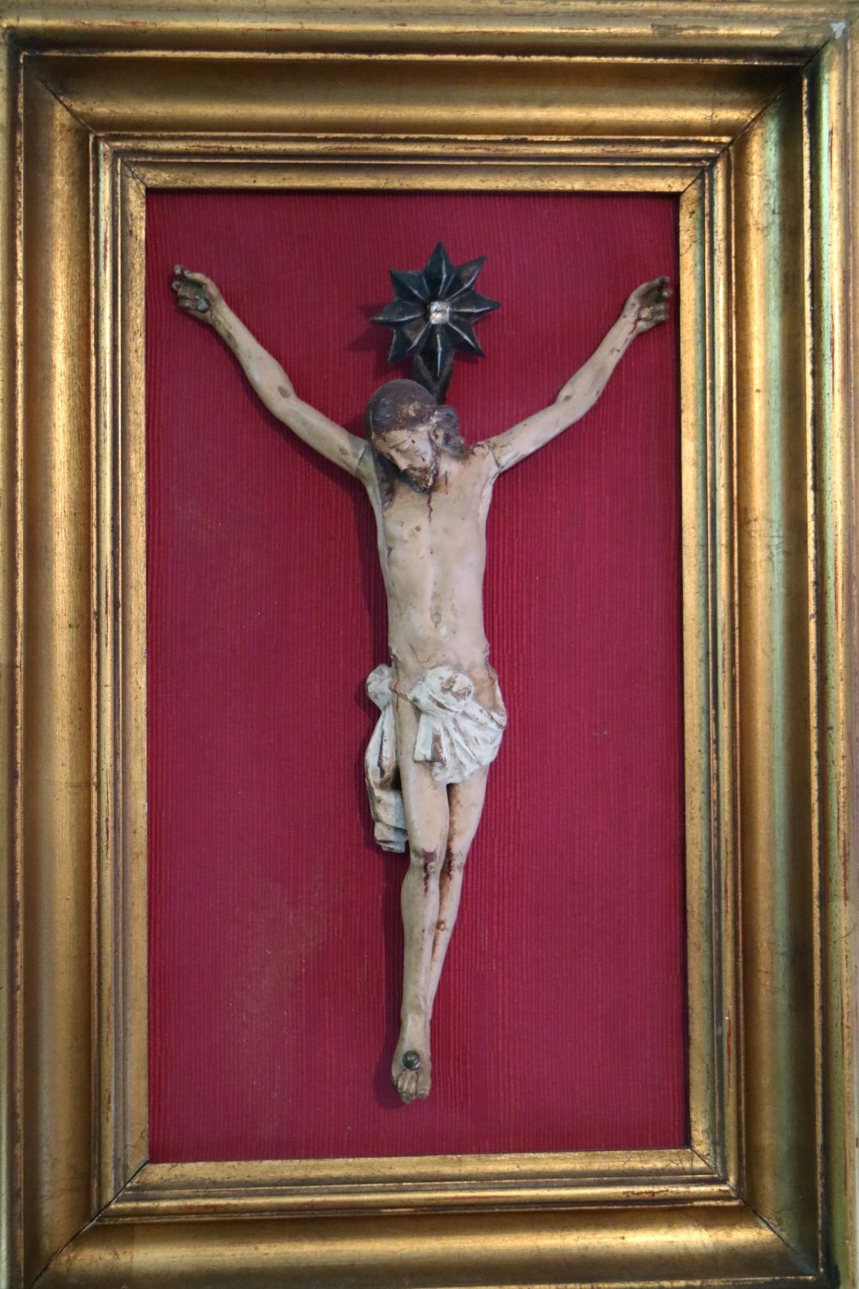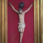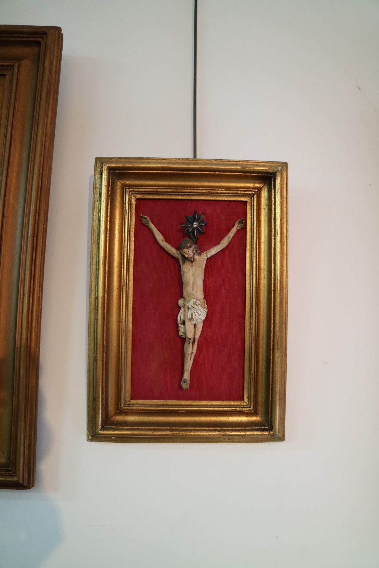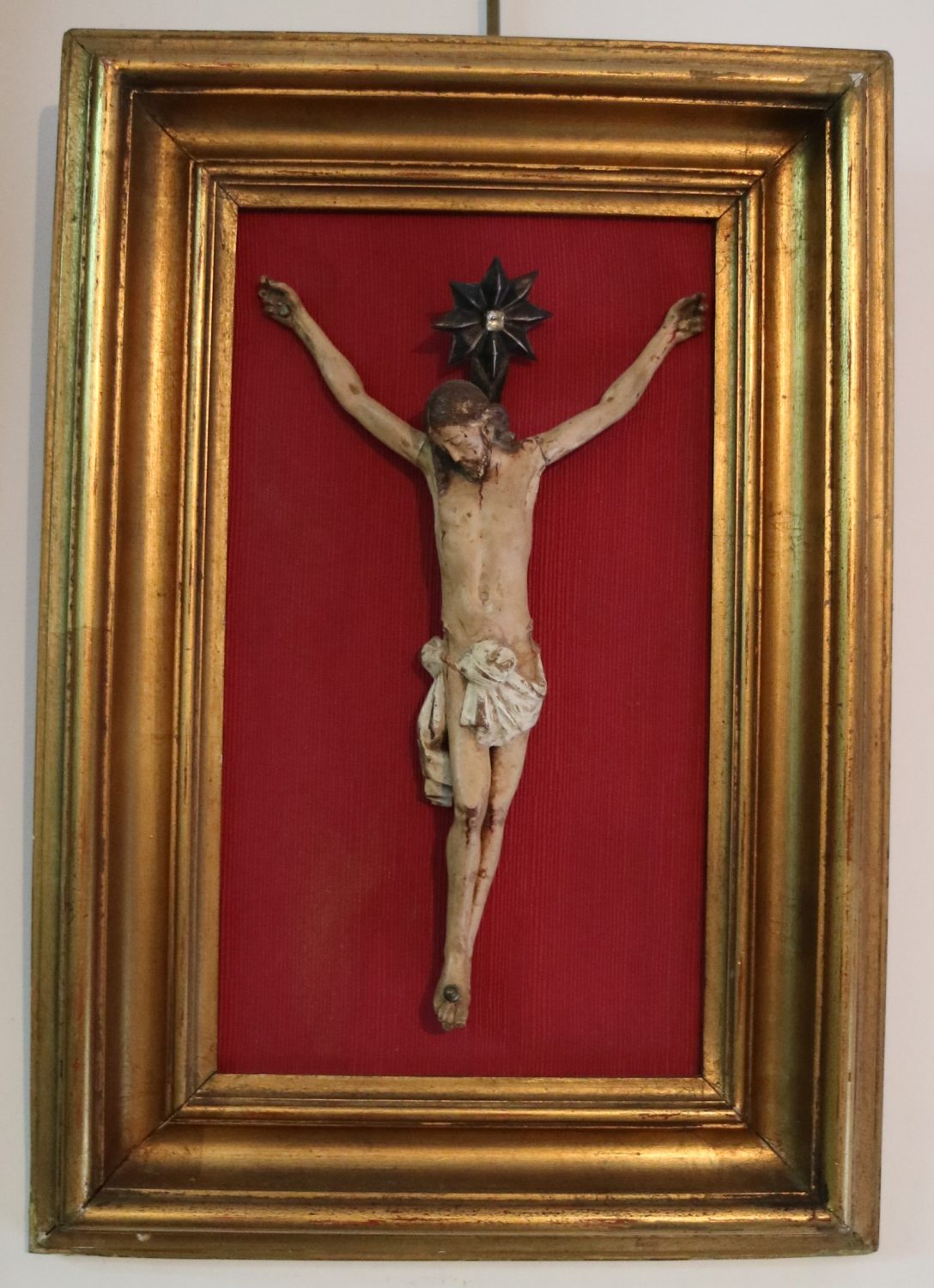 Placa de parede com Cristo em madeira policromada, resplendor em prata com pedra incolor. Moldura dourada revestida com tecido aveludado vermelho, e cravos em metal.