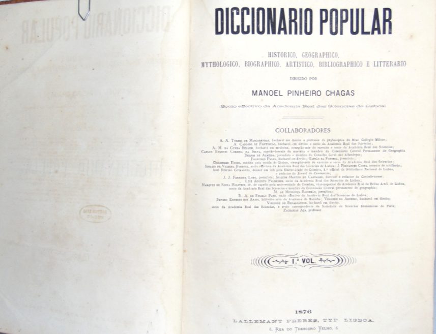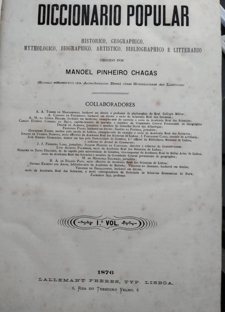 Conjunto de 8 Livros antigos de MANOEL PINHEIRO CHAGAS: DICCIONARIO POPULAR, HISTORICO, BIBLIOGRAPHICO E LITTERARIO. DIRIGIDO POR… LISBOA: TYPOGRAPHIA DA VIUVA SOUSA NEVES. 8 VOLS. E. Anos 1876-1884.