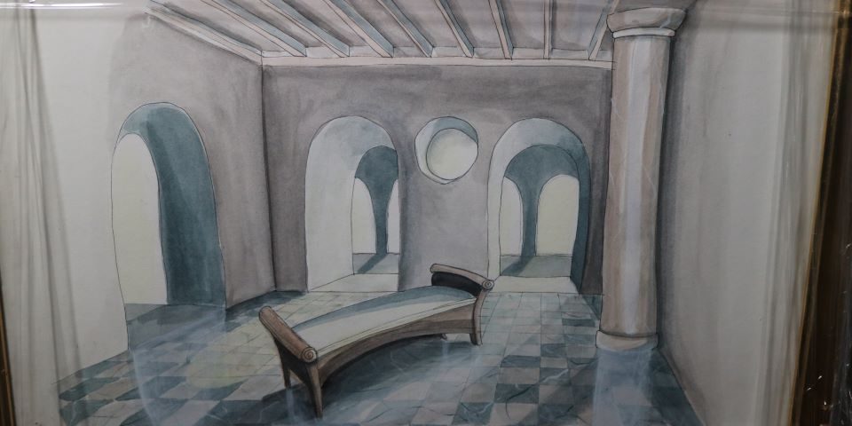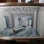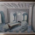 Nota: A pintura representa uma cena interior, possivelmente inspirada na arquitetura moura. A pintura retrata um espaço com arcos, uma coluna e um banco, com uma paleta de cores suaves e tons de cinza e azul. O estilo lembra um pouco as obras de Giorgio de Chirico, conhecido por suas paisagens urbanas metafísicas e atmosferas misteriosas.