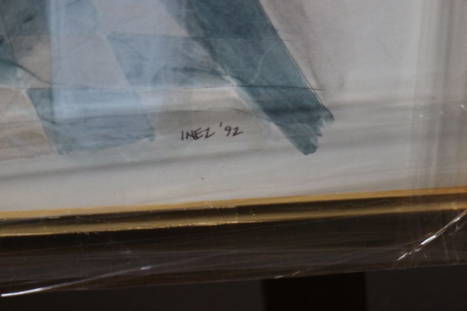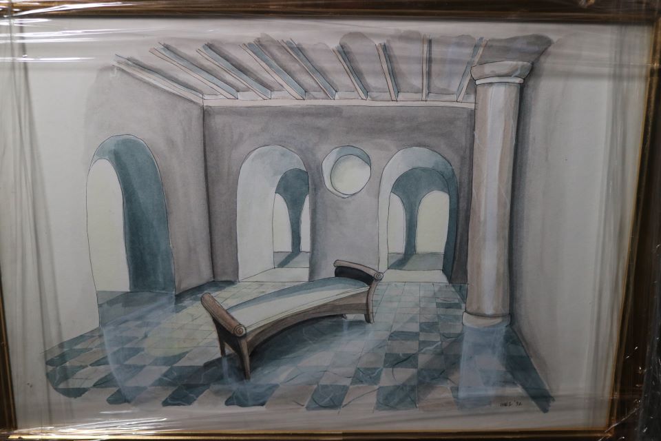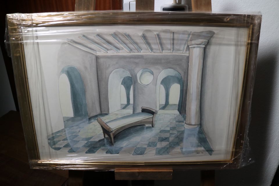 Técnica mista sobre papel de cartão, motivo «Interior de salão».