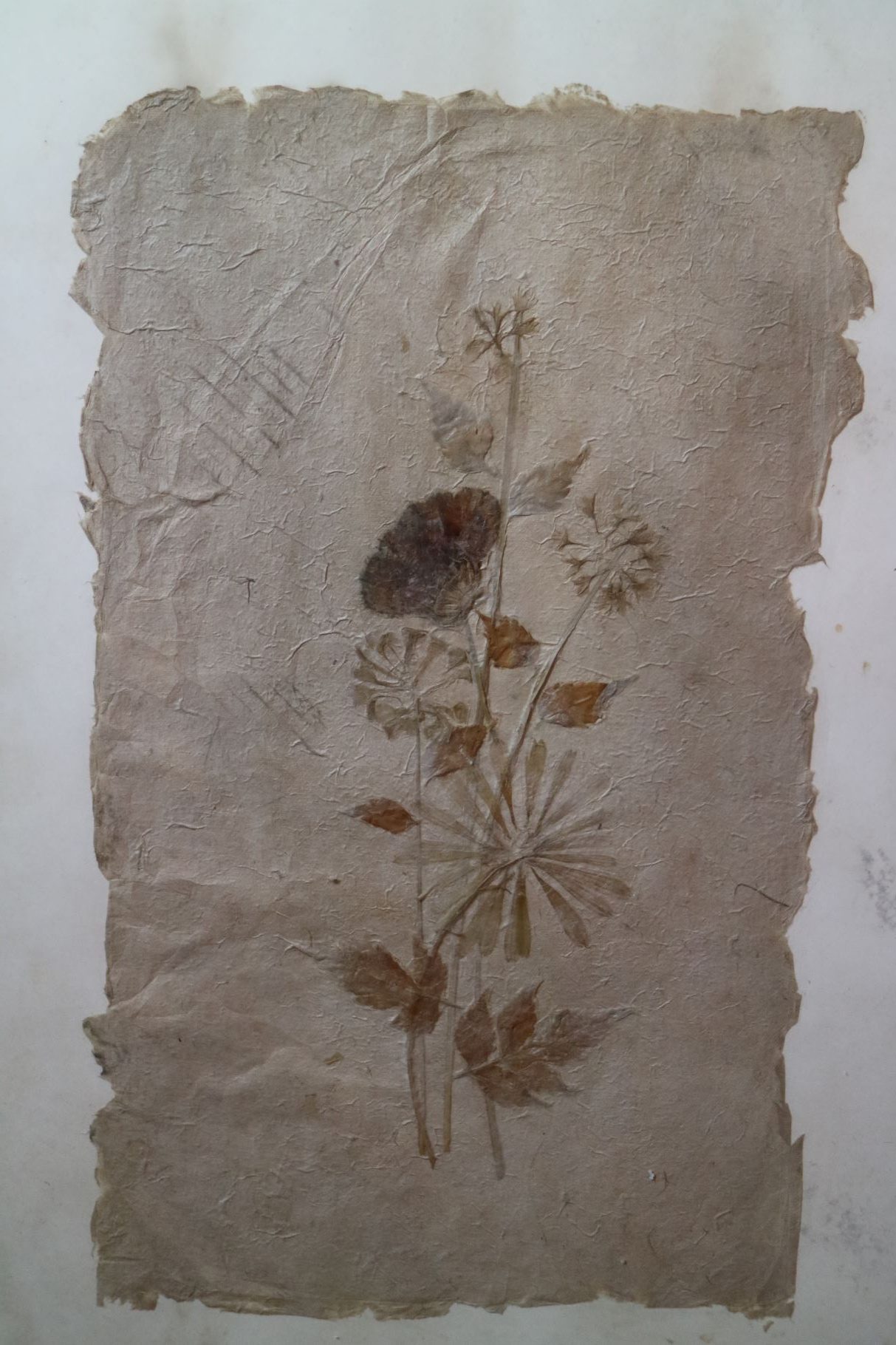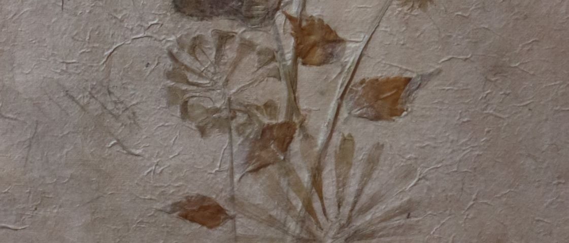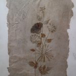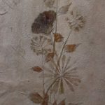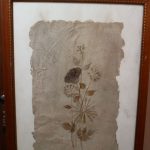 Técnica mista com colagens de folhas e flores secas sobre papel cartonado. Obra não assinada. Moldura com realce de losangos dourados.