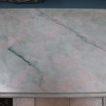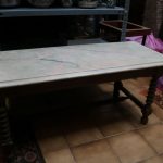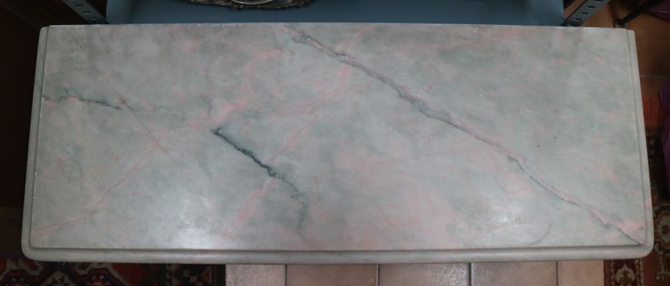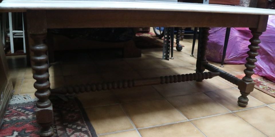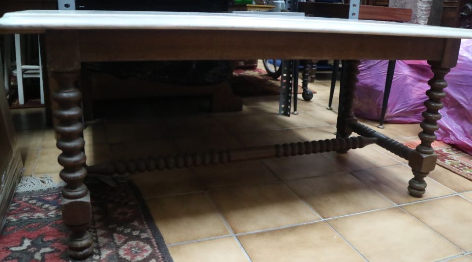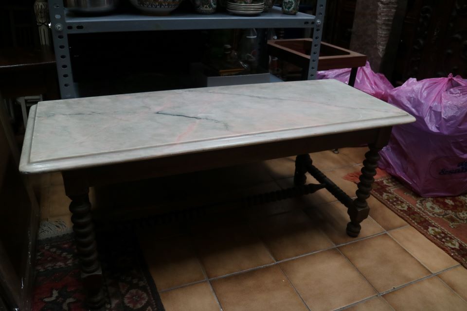 Mesa de frente de sofá de forma retangular. Estrutura em madeira escurecida de torneados com pilastra central e tampo de mármore rosa.