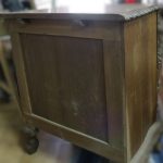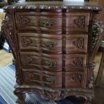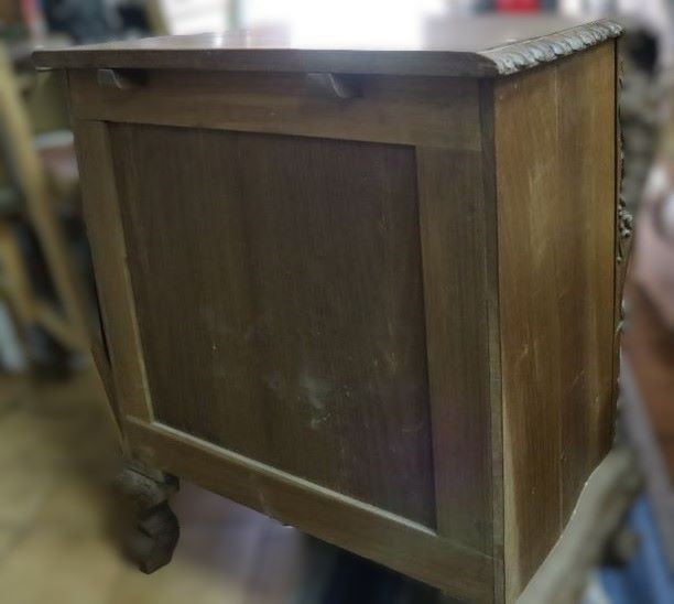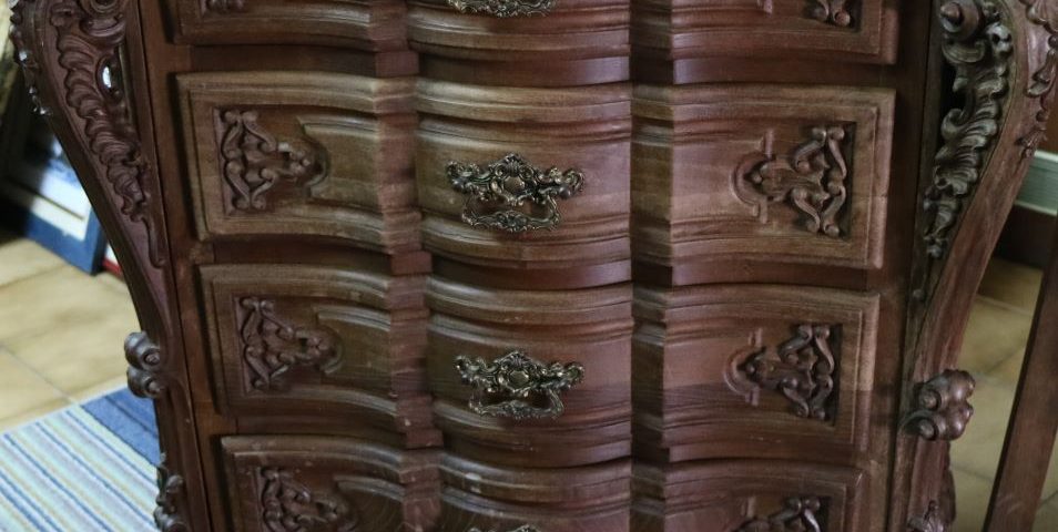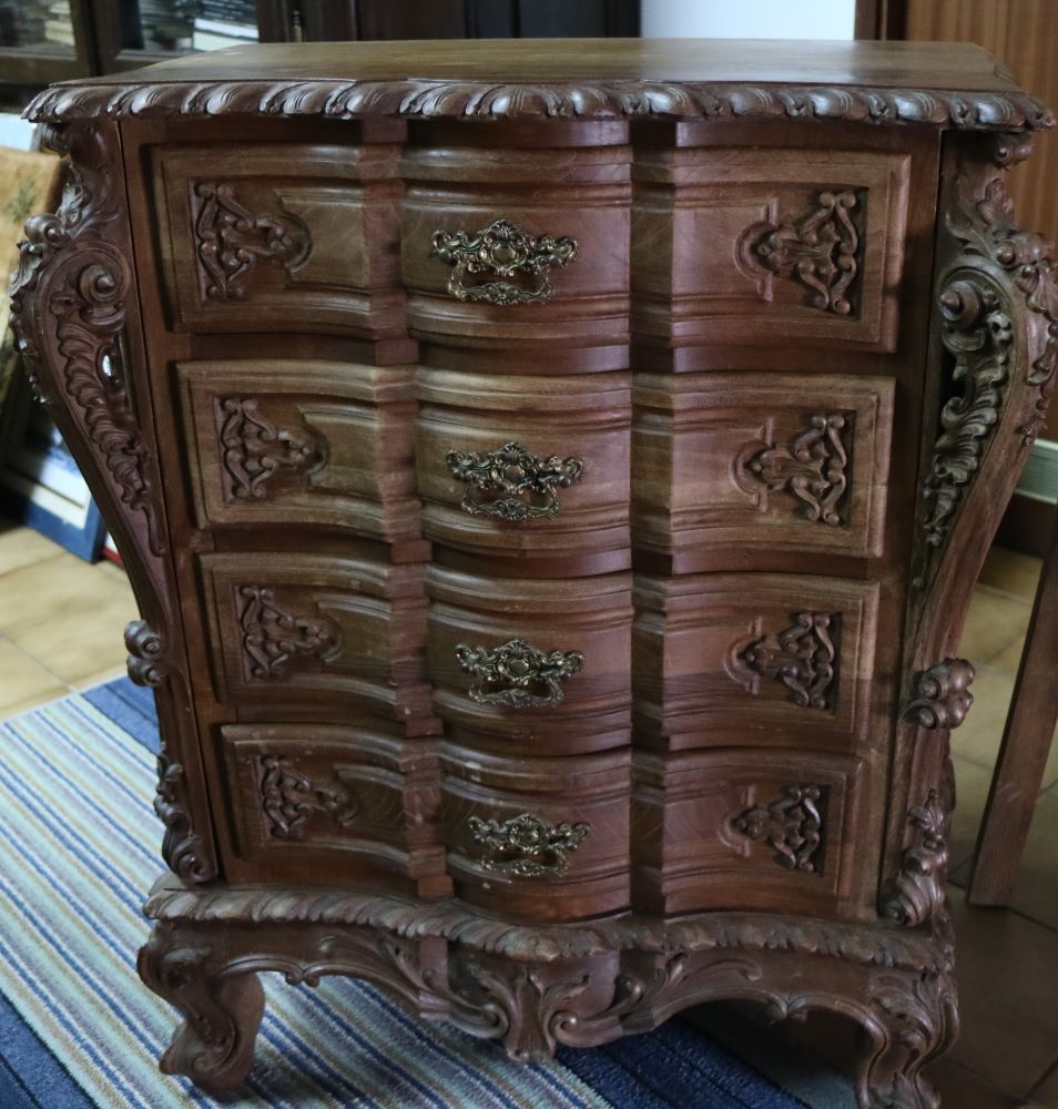Entalhamentos e florões com detalhes vegetalistas alusivos ao reinado D. José I (1750-1777), com 4 gavetas e ferragens em latão dourado.