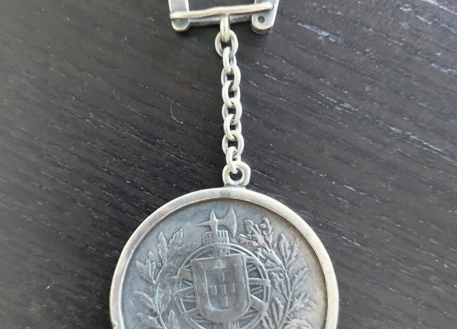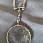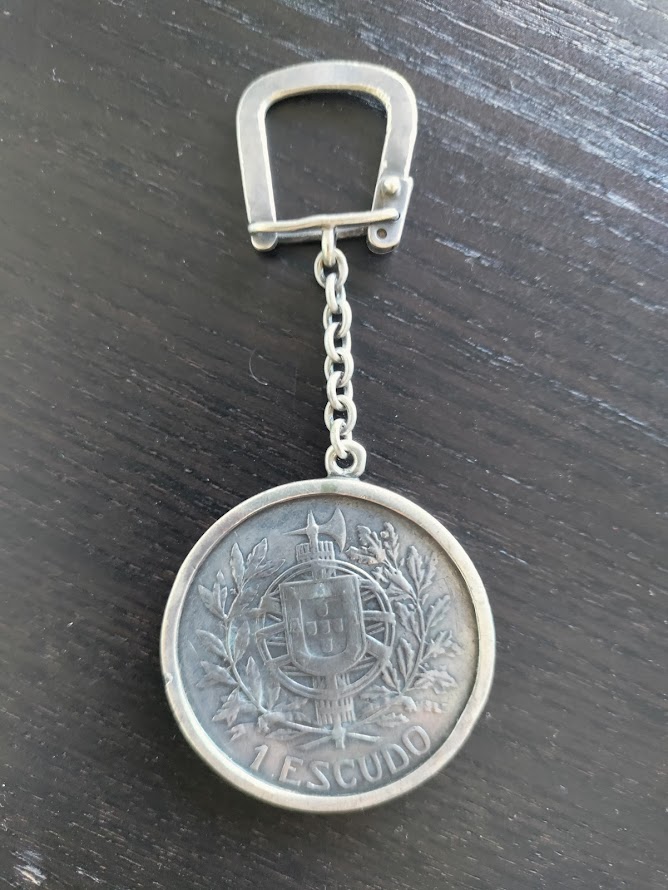 Porta-chaves com moeda de 1$00 escudo em prata da Implantação da República contraste de teor 833 milésimas.