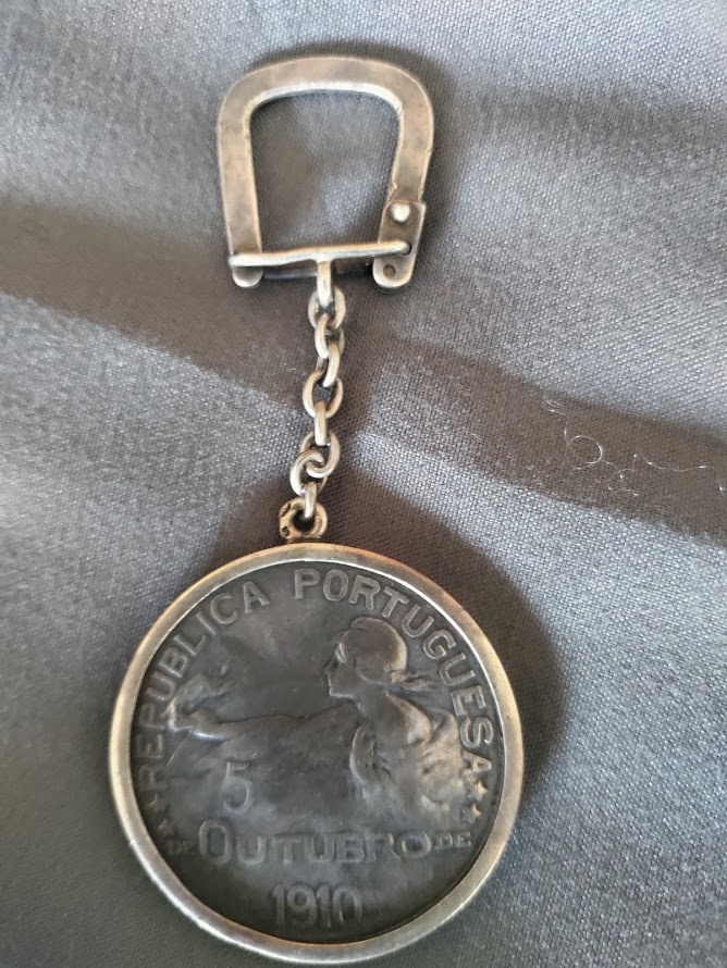 Porta chaves em prata contrastado de teor de 833/1.000, com moeda de 1 escudo de 5 Outubro 1910 - Implantação da República Portuguesa.