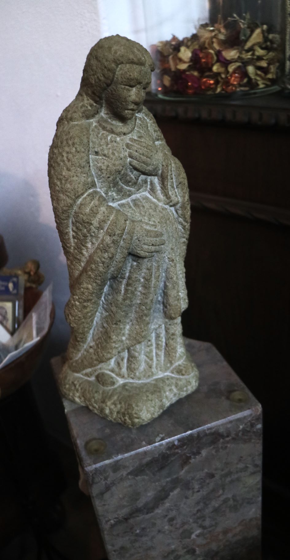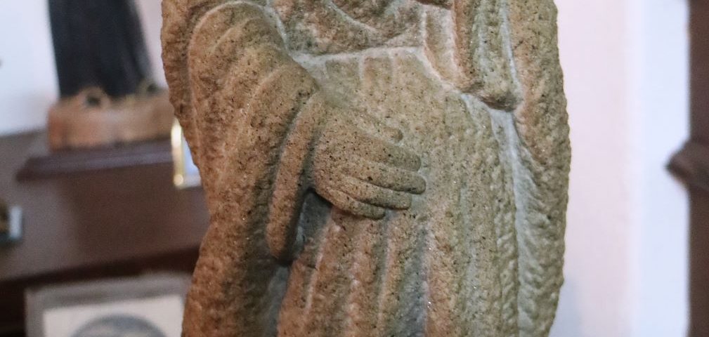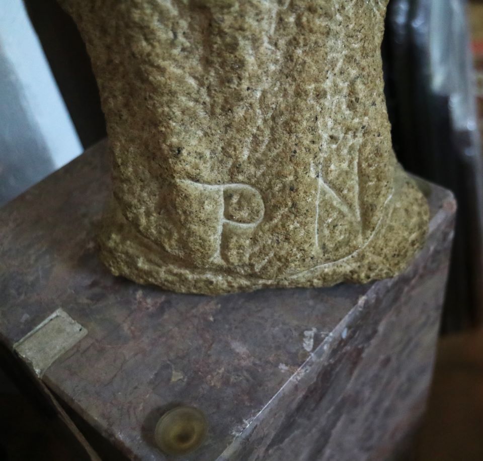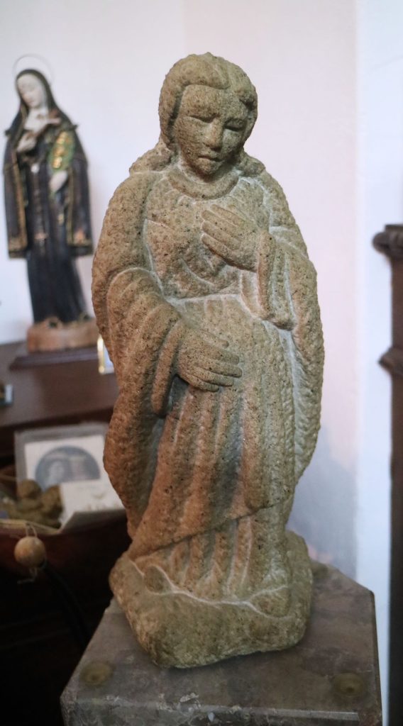 Imagem de devoção religiosa em pedra granítica, representando a Virgem Maria ou uma Nossa Senhora do "O" / “Ó” “. Pedestal em mármore rosa de formato de prisma quadrangular. Partes transversais esculpida de um lado em forma de pirâmide com cortes horizontais degradé, e do outro lado com um corte longitudinal na horizontal (vestígios de massa cerâmica no interior da ranhura, possivelmente cimento cola). Base com ventosas. Escultura assinada no verso com as iniciais «P.N.». Possivelmente Paulo Neves (n.1959).