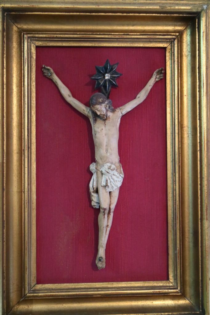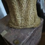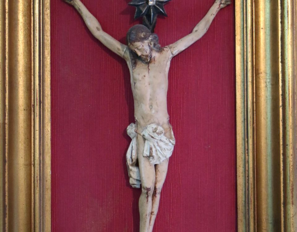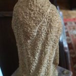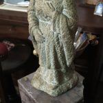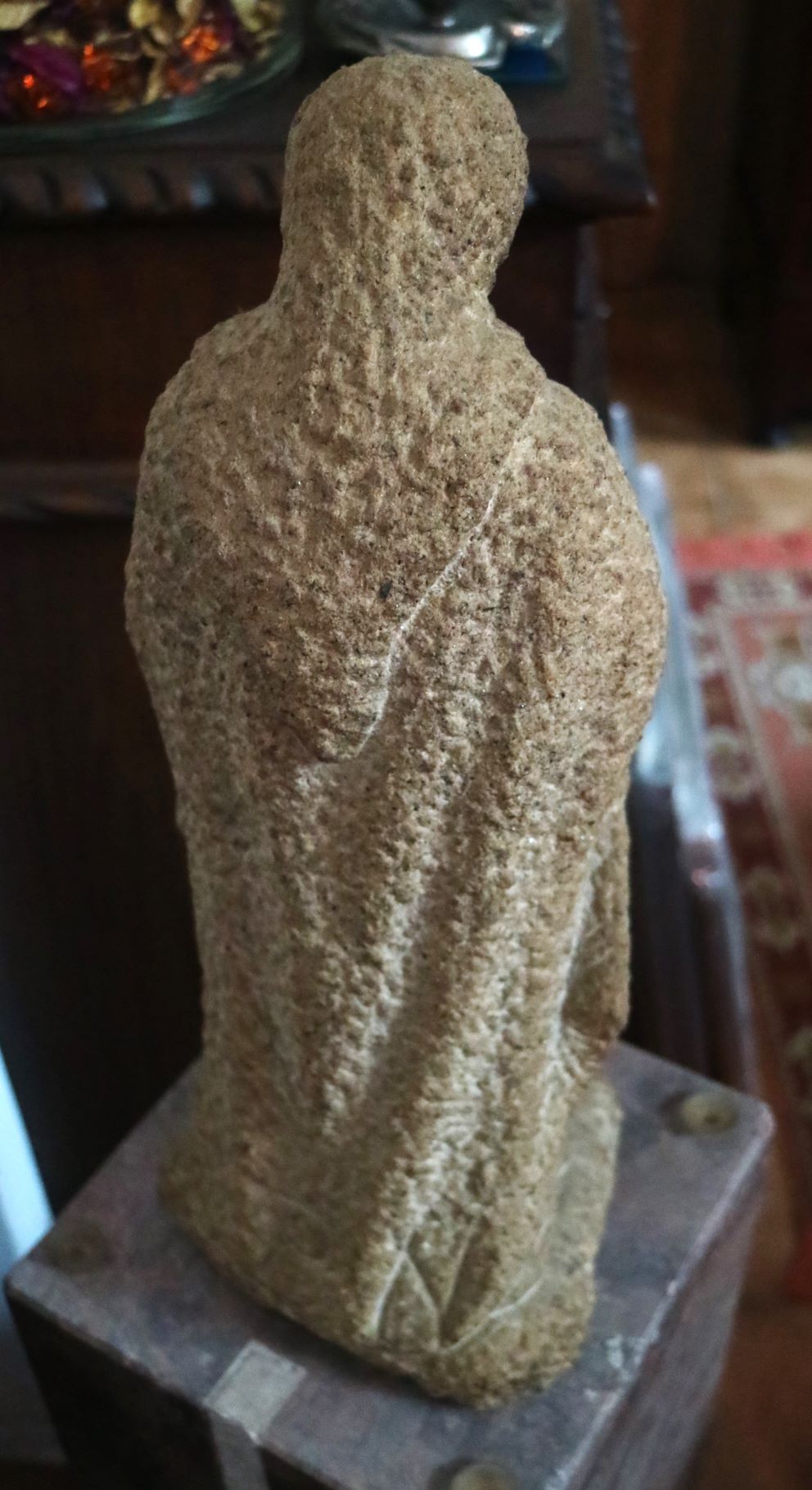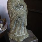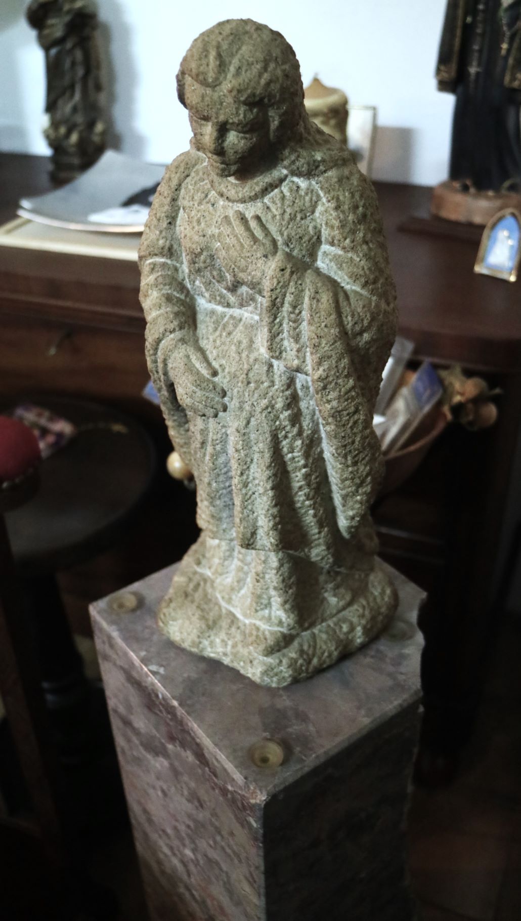 Imagem de devoção religiosa em pedra granítica, representando a Virgem Maria ou uma Nossa Senhora do "O" / “Ó” “. Pedestal em mármore rosa de formato de prisma quadrangular. Partes transversais esculpida de um lado em forma de pirâmide com cortes horizontais degradé, e do outro lado com um corte longitudinal na horizontal (vestígios de massa cerâmica no interior da ranhura, possivelmente cimento cola). Base com ventosas. Escultura assinada no verso com as iniciais «P.N.». Possivelmente Paulo Neves (n.1959).