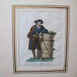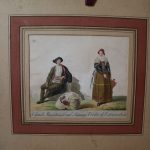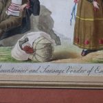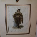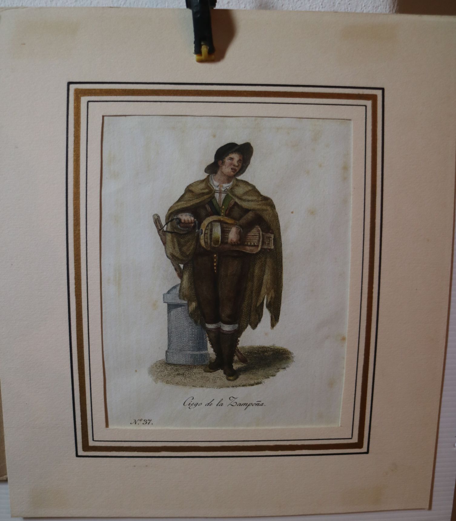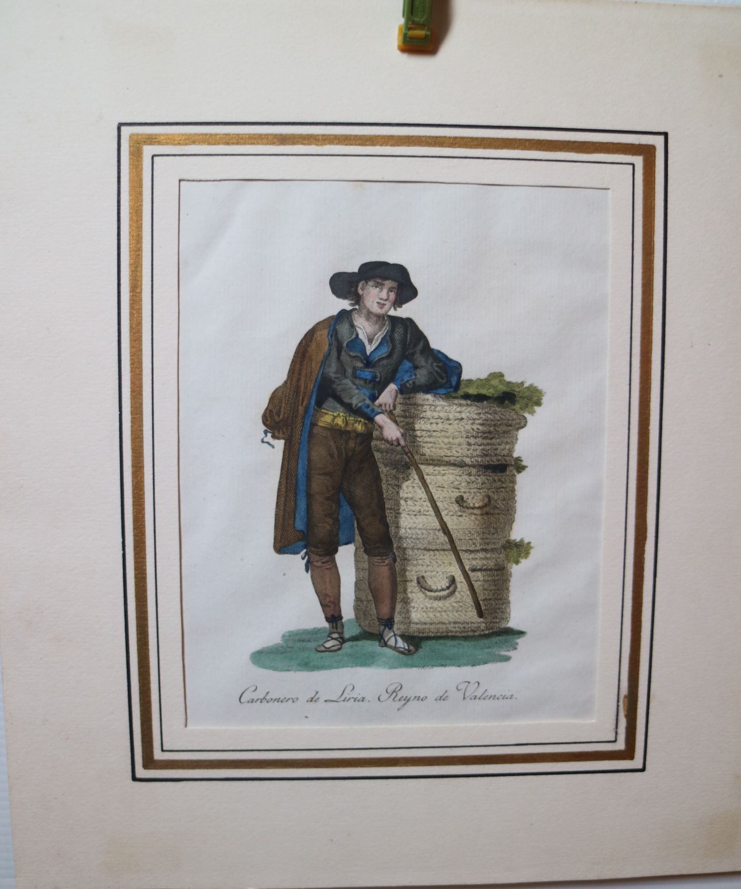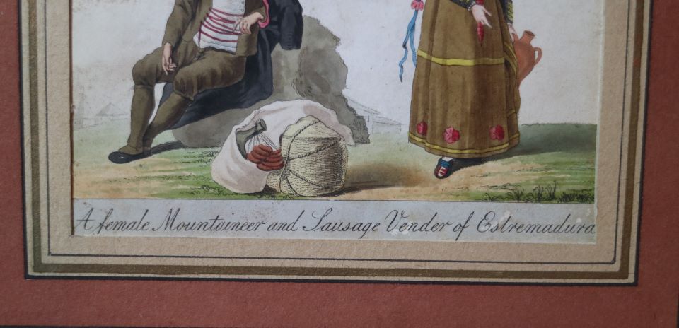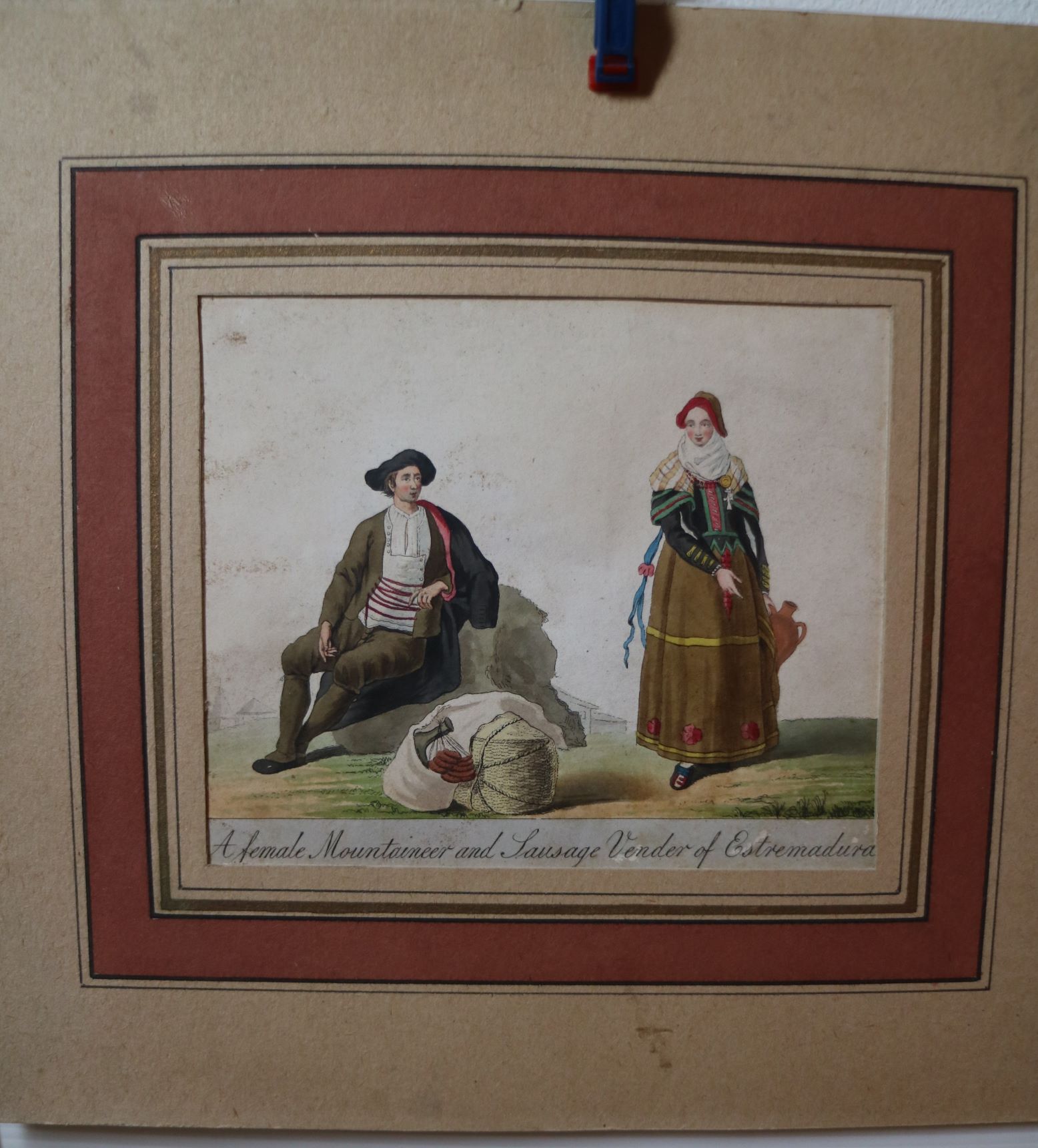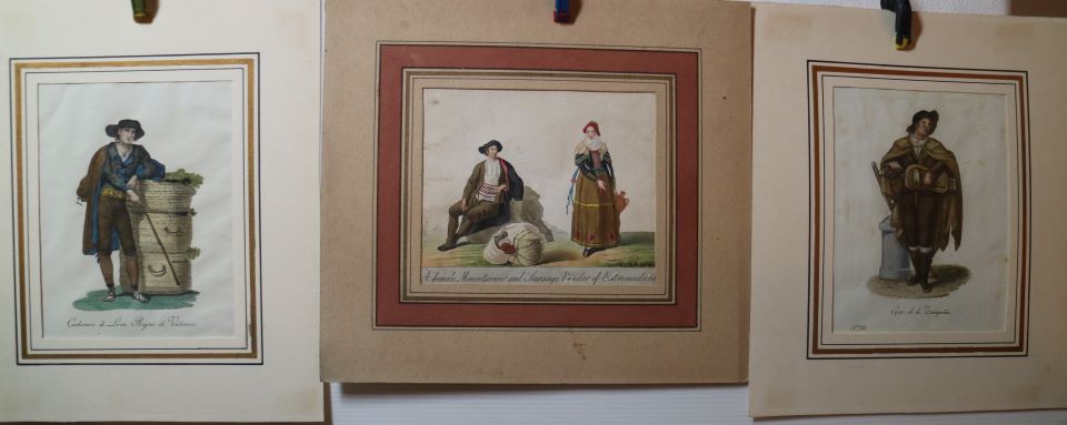 Conjunto de três gravuras coloridas intituladas "Carbonero de Liria – Reino de Valencia” de José Ribelles; “lamina Nº37 – Ciego de La Zampoña” de Henri L’Éveque ; e “A Female Mountaineer and Sausage Vender of Estremadura” de João Palhares.